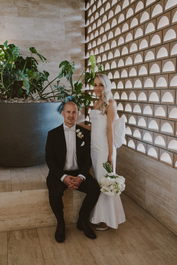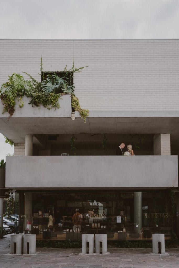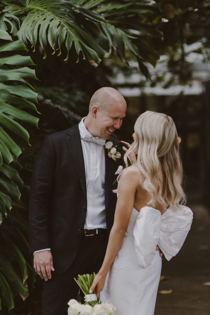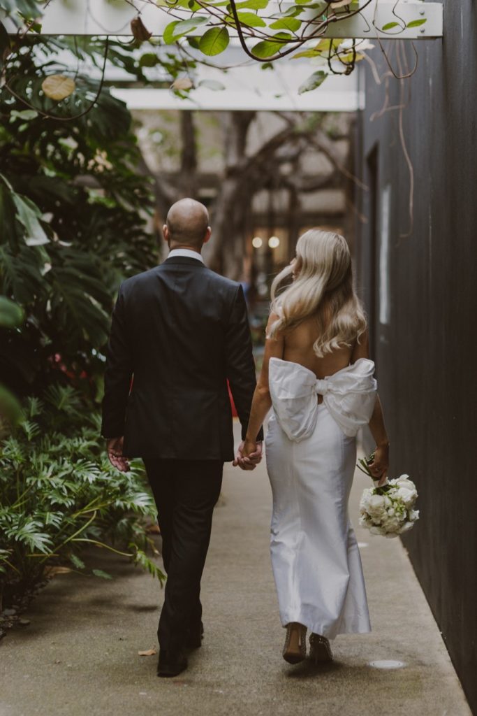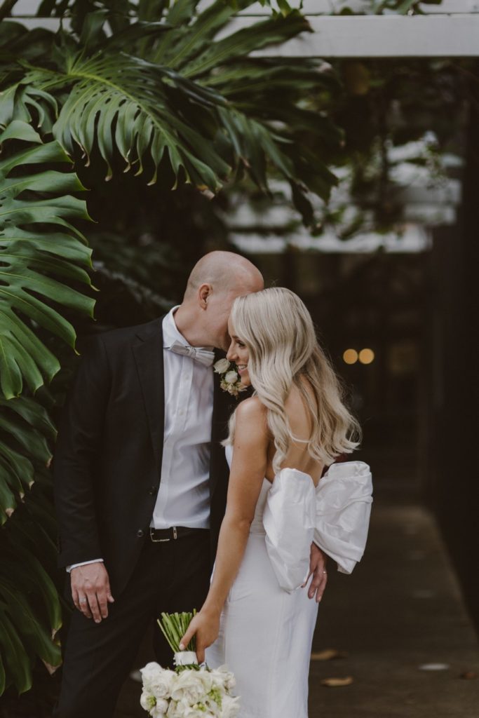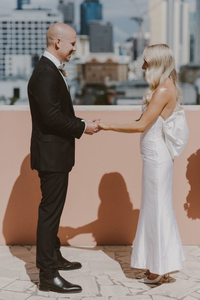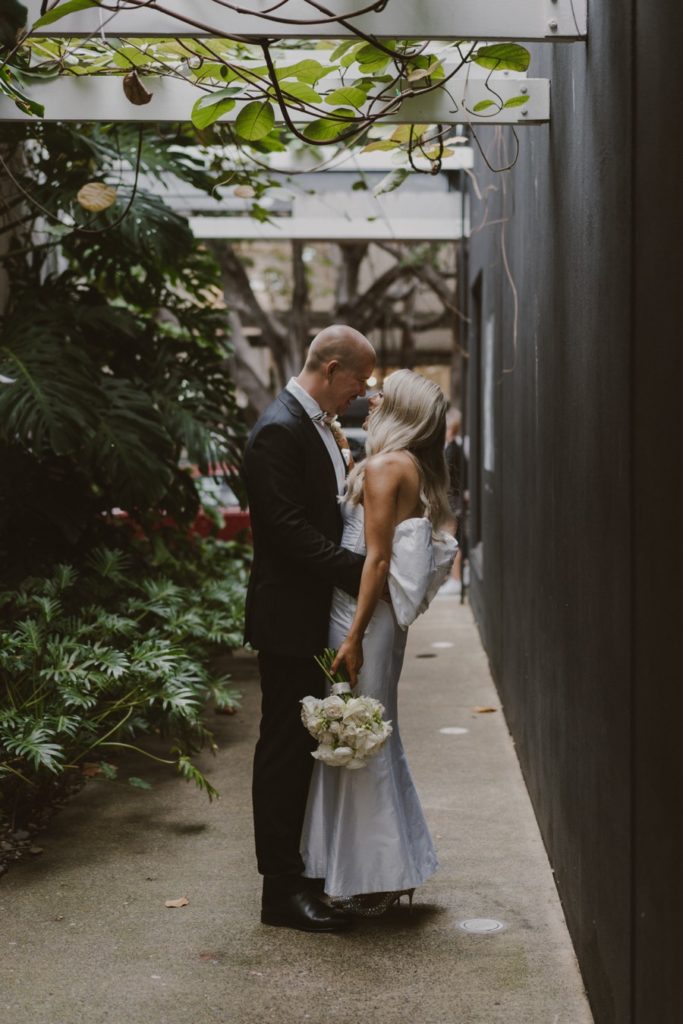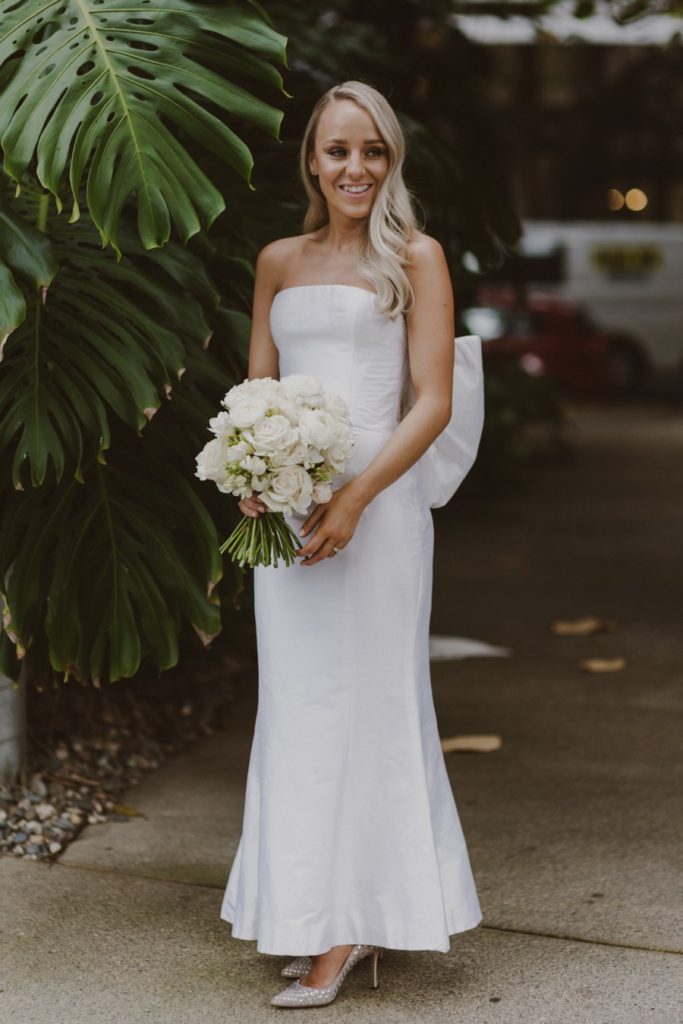 Pat & Juliet’s Calile Hotel intimate wedding was originally going to look vastly different. They had planned a big wedding at Maleny Manor with a lot of family and friends flying in from Tasmania. As we all know, 2020 had other plans, so they pivoted and what took place was an intimate, just as perfect day at The Calile Hotel with just their closest family. Some of which had to brave quarantine on arrival back to Tasmania. Juliet bought her gorgeous bow detailed gown pre loved, this stunner of a dress by Rasario x My Theresa was originally worn by model Olive Cooke on her wedding day. I would have sworn it was made for Juliet!