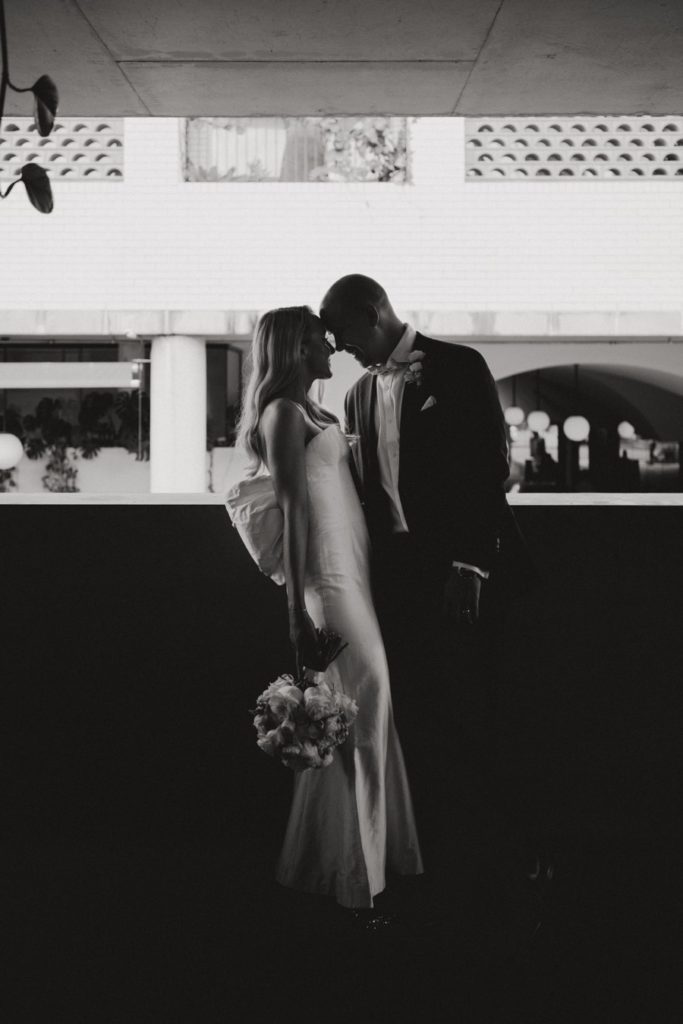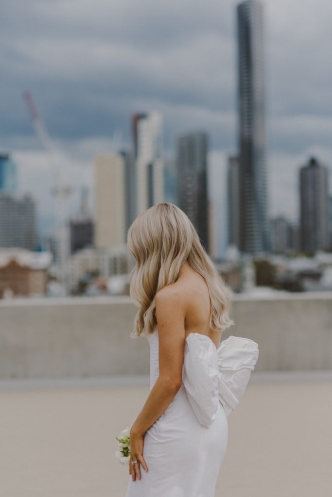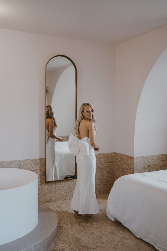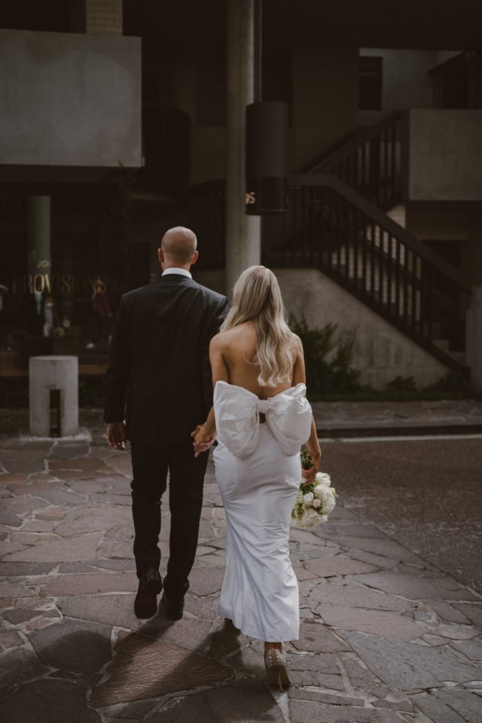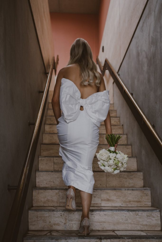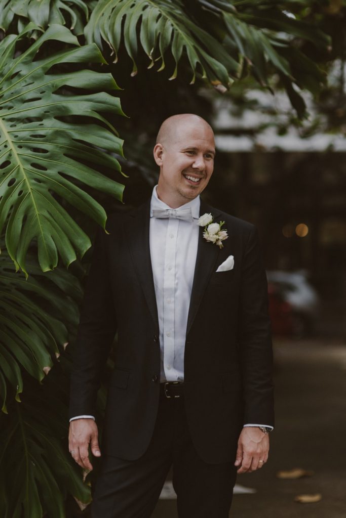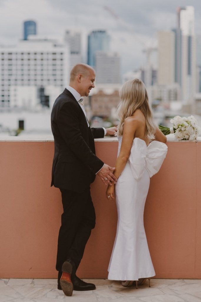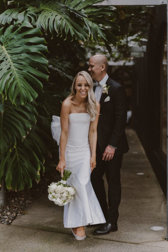 Pat & Juliet’s Calile Hotel intimate wedding was originally going to look vastly different. They had planned a big wedding at Maleny Manor with a lot of family and friends flying in from Tasmania. As we all know, 2020 had other plans, so they pivoted and what took place was an intimate, just as perfect day at The Calile Hotel with just their closest family. Some of which had to brave quarantine on arrival back to Tasmania. Juliet bought her gorgeous bow detailed gown pre loved, this stunner of a dress by Rasario x My Theresa was originally worn by model Olive Cooke on her wedding day. I would have sworn it was made for Juliet!