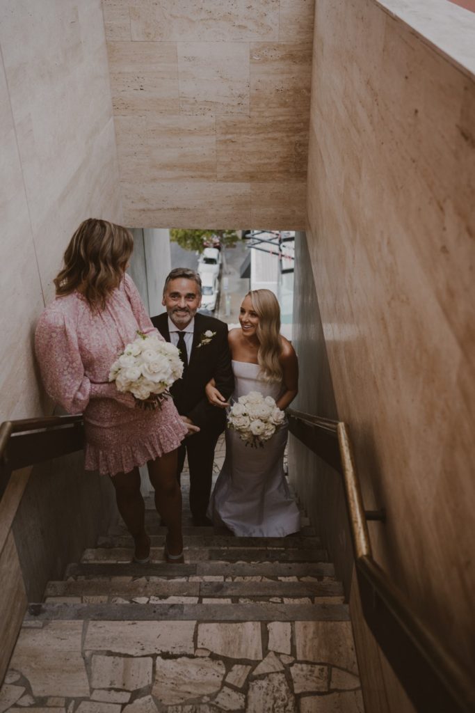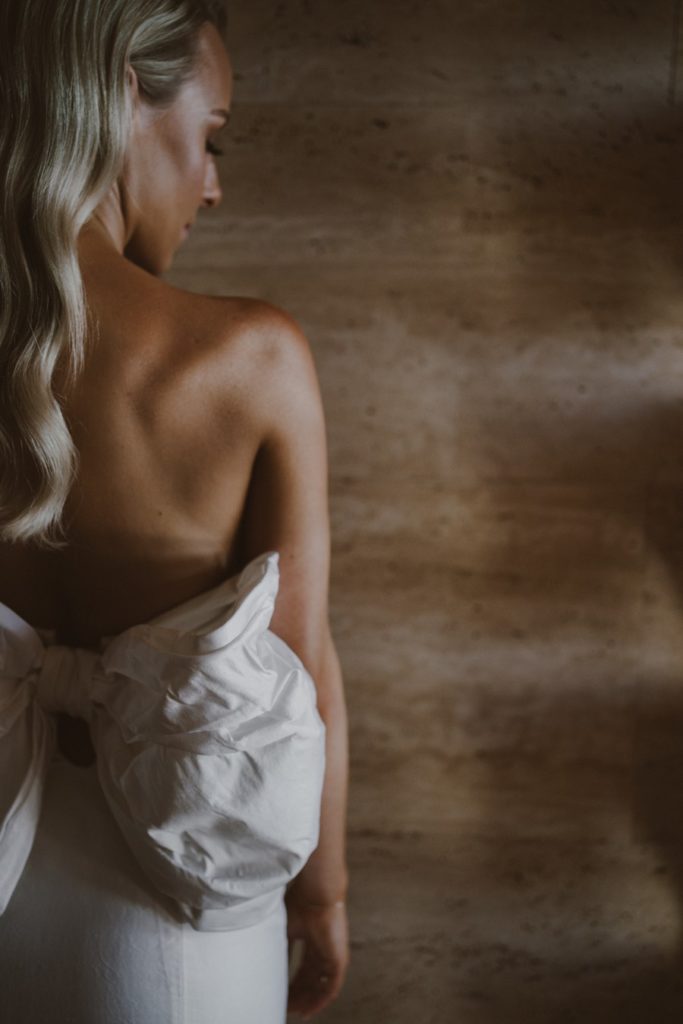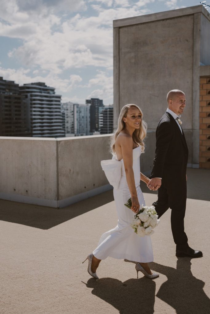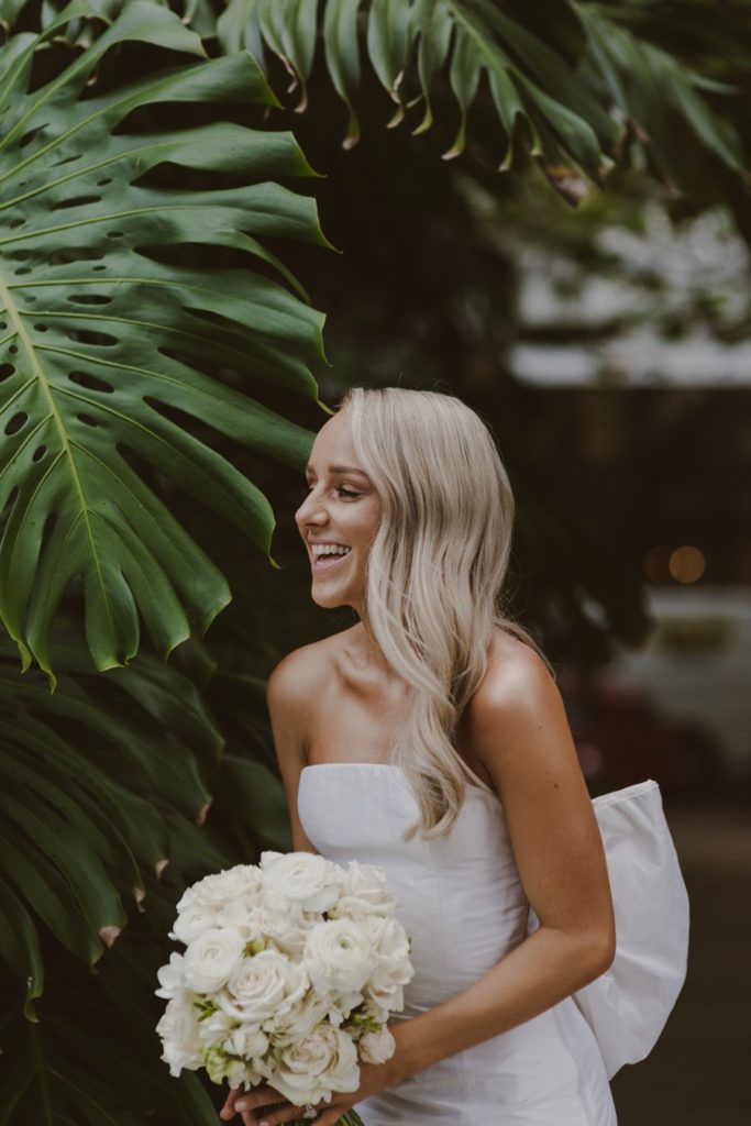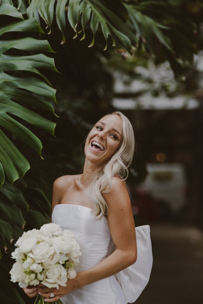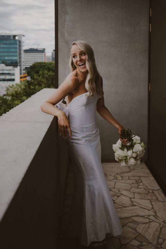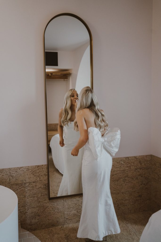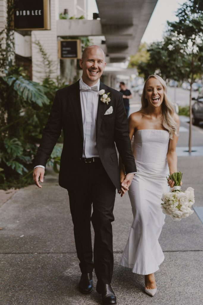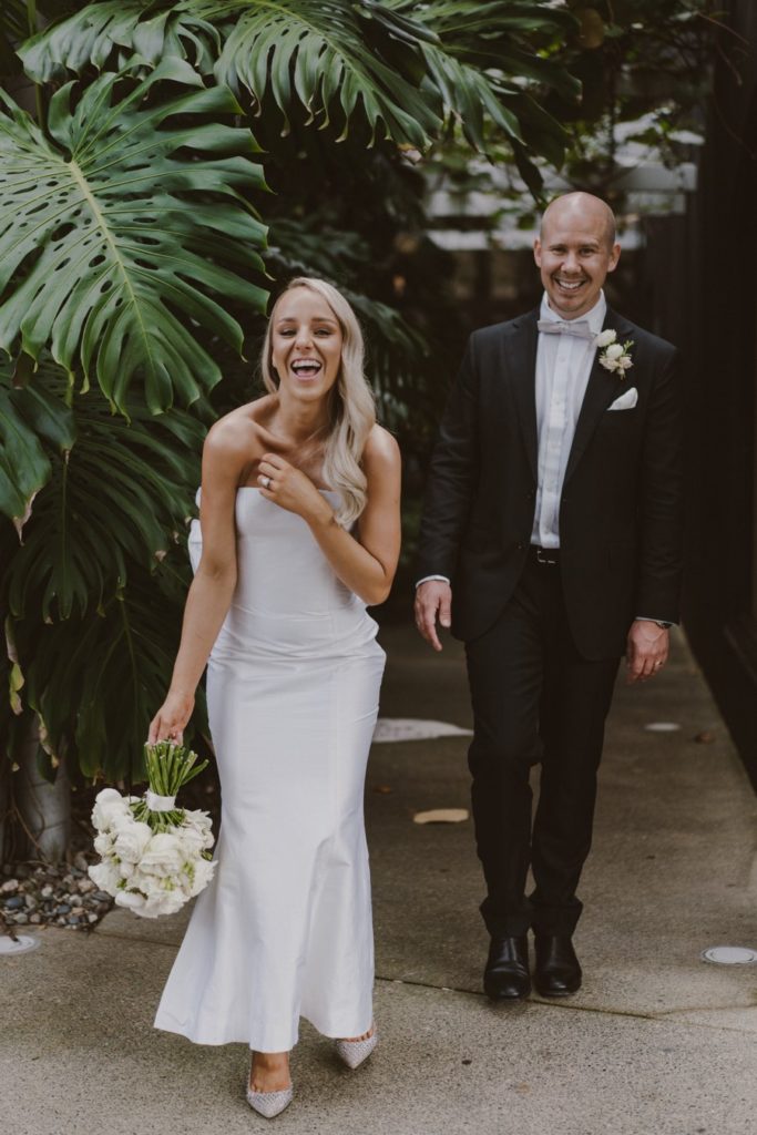 Pat & Juliet’s Calile Hotel intimate wedding was originally going to look vastly different. They had planned a big wedding at Maleny Manor with a lot of family and friends flying in from Tasmania. As we all know, 2020 had other plans, so they pivoted and what took place was an intimate, just as perfect day at The Calile Hotel with just their closest family. Some of which had to brave quarantine on arrival back to Tasmania. Juliet bought her gorgeous bow detailed gown pre loved, this stunner of a dress by Rasario x My Theresa was originally worn by model Olive Cooke on her wedding day. I would have sworn it was made for Juliet!
