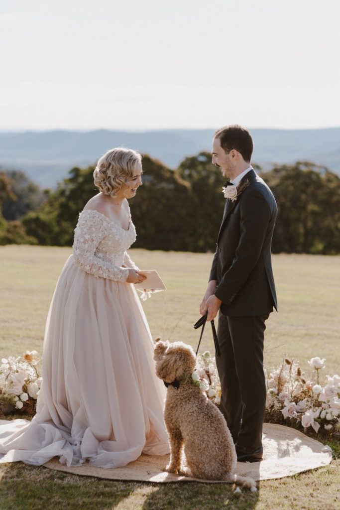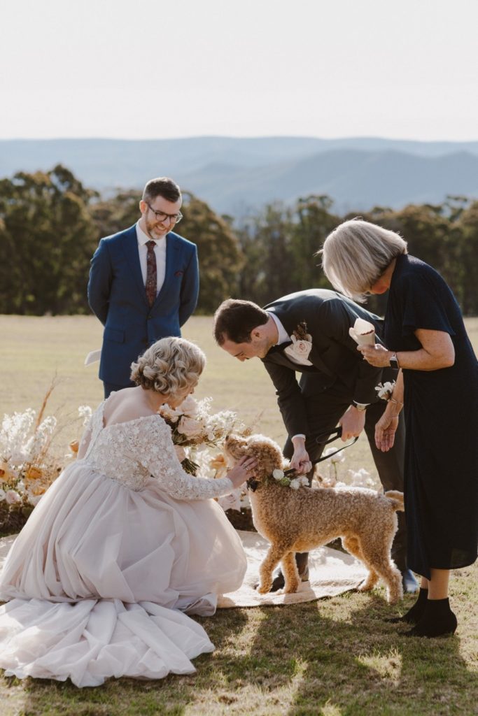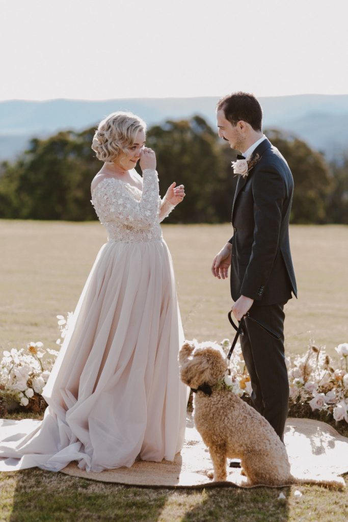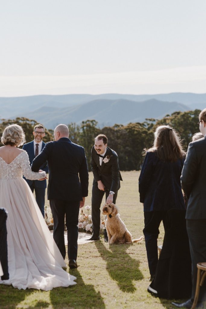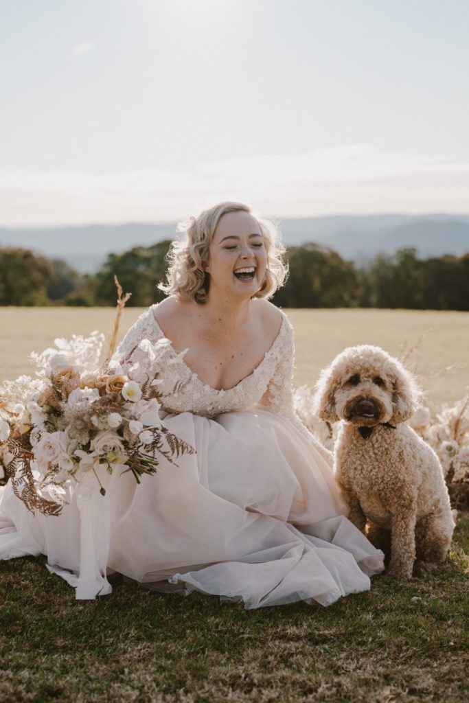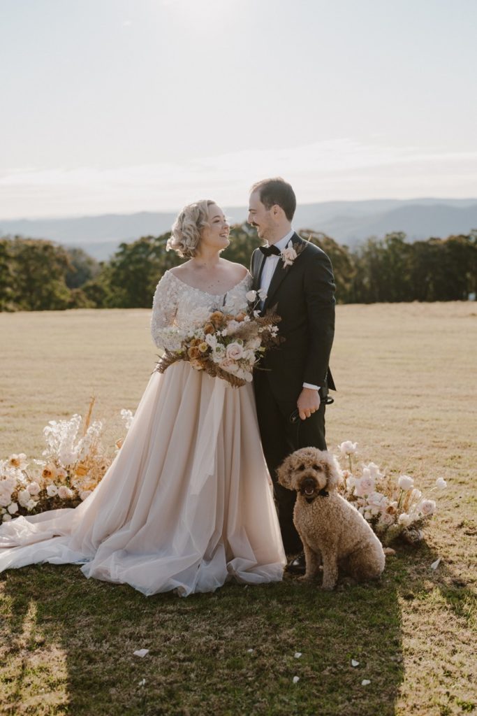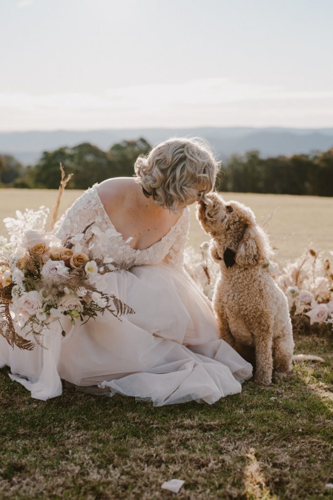 This was a fairy-tale of a wedding day with the most stunning meadow inspired florals on a perfect winter day. Kate & Jacob chose Spicers Peak Lodge for their intimate wedding, inviting just their closest friends and family. It was mid 2021 craziness and their wedding just slipped between two sets of stay at home snap lock downs. Kate was stunning in a tule and lace Luce Sposa gown. The cherry on the cake was their Labradoodle Moe, who’s attendance was a surprise gift from Jacob to Kate as a wedding present.